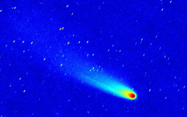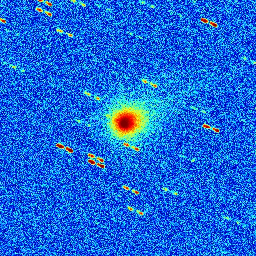 Komet C/2025 A6 (Lemmon) am 20.09.2025, f = 600 mm, QHY294C, IRB-Filter, 28:30 Minuten Belichtungszeit, 70% der Originalauflösung. Das Bild wurde um ca. 02:00 UT vor der Morgendämmerung durch eine Schicht aus mehr oder weniger dünnen Cirrus-Wolken aufgenommen. Die Farbversion zeigt, dass die Coma im grünen Licht der C2-Emission leuchtet. Außerdem ist die Coma in Richtung Nordwesten (oben rechts) leicht elongiert. Das invertierte und kontrastverstärkte Grauwertbild und das Falschfarbenbild zeigen andeutungsweise einen kurzen geraden Schweif, der ebenfalls in diese Richtung zeigt.