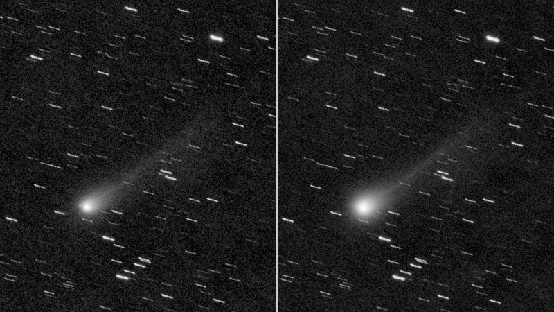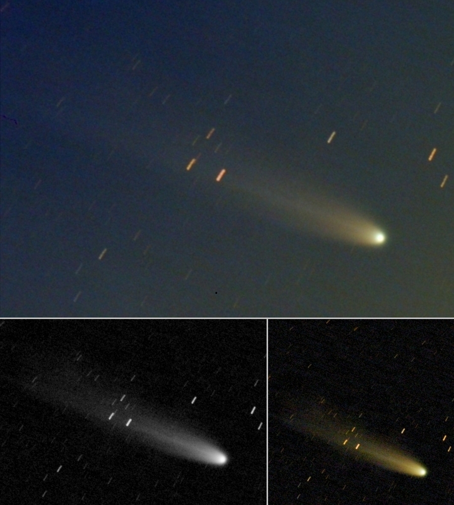Komet C/2025 A6 (Lemmon) am 28.09.2025, f = 300 mm bzw. f = 600 mm, QHY294C bzw. TIS-Monochrom-Kamera, IRB-Filter bzw. 570-nm-Kantenfilter, 34:30 bzw. 10:04 Minuten Belichtungszeit, 50% bzw. 500% der Originalauflösung. Das Farbbild wurde um ca. 03:30 UT unmittelbar vor der Morgendämmerung durch eine Wolkenlücke aufgenommen. Die Coma leuchtet weiterhin überwiegend im grünen Licht der C2-Emission. Ein gerader Schweif, wahrscheinlich ein Gasschweif, erstreckt sich in Richtung Nordwesten (oben rechts). Das untere linke Bildpaar zeigt separat den Rotkanal (links) und den Grükanal (rechts). Der Rotkanal gibt dabei überwiegend die Staubkomponente des Kometen wieder, so dass beispielsweise ein kurzer breiter Staubschweif erkennbar ist, wohingegen im Grünkanal die Gaskomponente dominiert, insbesondere die Coma und der gerade schmale Gasschweif. Das Bild der Coma wurde parallel dazu mit der Monochrom-Kamera und einem Orangefilter aufgenommen, der Wellenlängen kürzer als 570 nm absorbiert. Auf diese Weise werden die blauen und grünen Gas-Emissionen ausgeblendet, so dass der Staubanteil der Coma mit dem Ansatz des Staubschweifs hervortritt.
