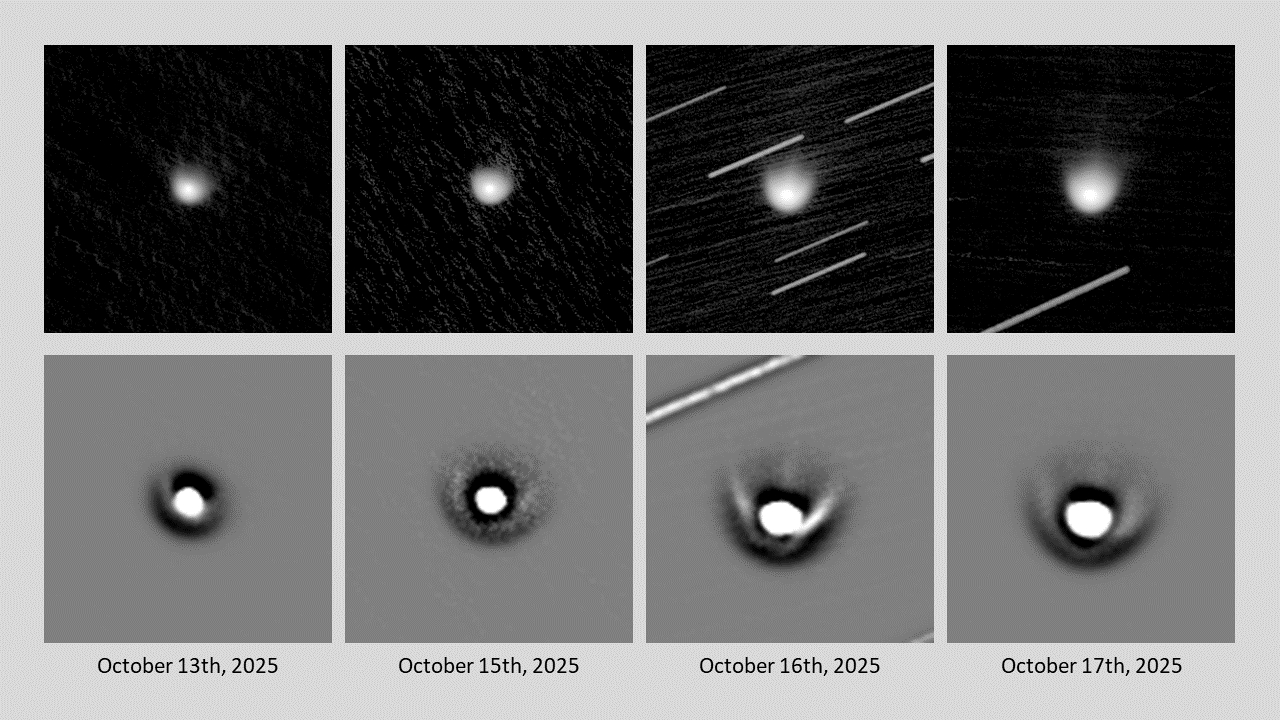 Komet C/2025 A6 (Lemmon) am 13.-17.10.2025, f = 600 mm, DZK 33UX250, 570-nm-Orange-Kantenfilter. Die Bilder wurde jeweils zwischen ca. 03:00 und 04:00 UT unmittelbar vor der Morgendämmerung auf dem Ballon d'Alsace unter hervorragenden Wetterbedingungen aufgenommen. Die obere Reihe zeigt jeweils das Intensitätsbild in identischer logarithmischer Skalierung, die untere Reihe die vergrößerte und hochpassgefilterte Variante. Deutlich sind dabei Staub-Jets zu erkennen, die orthogonal zur Richtung zur Sonne aus dem inneren Bereich der Coma austreten.