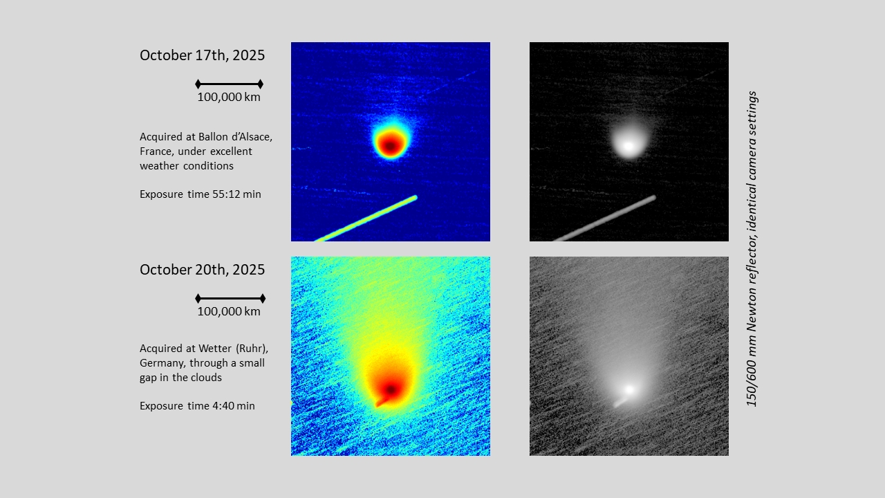 Komet C/2025 A6 (Lemmon) am 20.10.2025, f = 600 mm, DZK 33UX250, 570-nm-Orange-Kantenfilter, ca. 18:00 UT, 4:40 Minuten Belichtungszeit, im Vergleich zur Aufnahme vom 17.10.2025. Die Intensitäten sind in identischer logarithmischer Skalierung wiedergegeben. Während des zeitlichen Abstands von 87 Stunden zwischen den beiden Bildern hat sich der Durchmesser der Coma offenbar um mindestens 80% vergrößert, was wohl eher noch eine Untergrenze darstellt, da das zweite Bild unter viel ungünstigeren Beobachtungsbedingungen und mit einer um einen Faktor 12 kürzeren Belichtungszeit als das erste aufgenommen wurde. Auch der Staubschweif ist deutlich heller und breiter geworden (das Orange-Filter blockiert die grünen und blauen Gas-Emissionen, so dass diese auf den Bildern nicht sichtbar sind). Der Abstand zwischen Komet und Sonne nimmt kontinuierlich ab und beträgt mittlerweile weniger als 0.7 AE (JPL Horizons Ephemeris). Infolgedessen könnten Eisablagerungen unter der Oberfläche des Kometenkerns durch die zunehmende Sonneneinstrahlung erhitzt worden sein, was zu ihrer schnellen Sublimation und einer anschließenden massiven Freisetzung von Staubpartikeln in die Coma und den Schweif geführt haben würde.