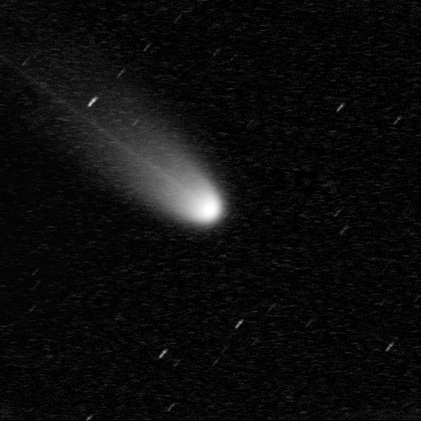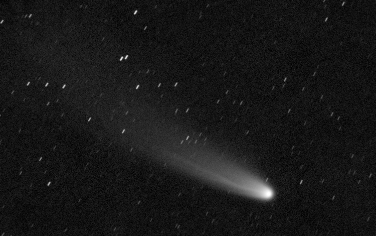 Komet C/2025 A6 (Lemmon) am 02.10.2025, f = 300 mm, QHY294C, IRB-Filter, 43:30 Minuten Belichtungszeit, 50% der Originalauflösung. Das Bild wurde um ca. 04:00 UT unmittelbar vor der Morgendämmerung bei durchziehenden dünnen Wolken aufgenommen. Die intensive grüne C2-Emission der Coma ist weiterhin dominant, ebenso wie der schmale gerade Gasschweif. Mittlerweile ist jedoch auch ein weiter aufgefächerter Staubschweif sichtbar, der nicht genau parallel zum Gasschweif verläuft.