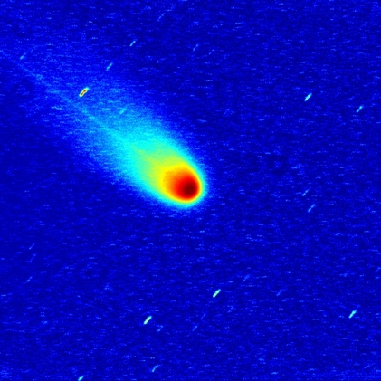 Komet C/2025 A6 (Lemmon) am 30.10.2025, f = 600 mm, DZK 33UX250, 570-nm-Orange-Kantenfilter, ca. 18:00 UT, 9:56 Minuten Belichtungszeit, im Vergleich zur Aufnahme vom 27.10.2025. Beide Bilder wurden auf einen einheitlichen Maßstab skaliert. Die Intensitäten sind in identischer logarithmischer Skalierung in Falschfarben wiedergegeben. Obwohl die Aufnahme vom 30.10.2025 durch dünne Cirruswolken beeinträchtigt wurde, erscheint der Staubschweif deutlich ausgeprägter als noch drei Tage zuvor. Offenbar kam es ähnlich wie am 17./20.10.2025 in den 72 Stunden zwischen den Aufnahmezeitpunkten der Bilder zu einer Freisetzung von großen Mengen an Staub.
