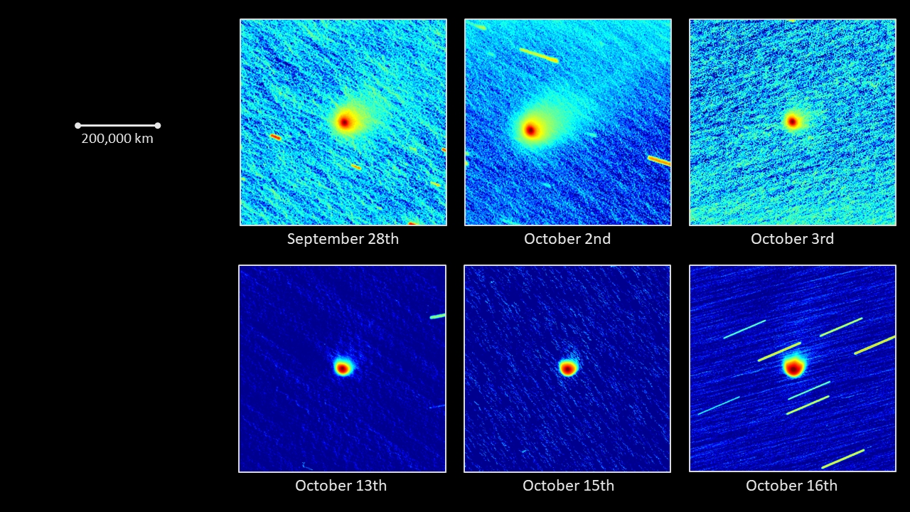 Komet C/2025 A6 (Lemmon) am 13.-17.10.2025, f = 600 mm, DZK 33UX250, 570-nm-Orange-Kantenfilter. Die Bilder wurde jeweils zwischen ca. 03:00 und 04:00 UT unmittelbar vor der Morgendämmerung auf dem Ballon d'Alsace unter hervorragenden Wetterbedingungen aufgenommen. Die obere Reihe zeigt jeweils das Intensitätsbild in identischer logarithmischer Skalierung, die untere Reihe die vergrößerte und hochpassgefilterte Variante. Deutlich sind dabei Staub-Jets zu erkennen, die orthogonal zur Richtung zur Sonne aus dem inneren Bereich der Coma austreten. Die untere Zusammenstellung zeigt den Kometen im Zeitraum 28.09.-16.10.2025 in einheitlichem Maßstab und illustriert so zeitliche Veränderungen der Größe der Staubcoma.