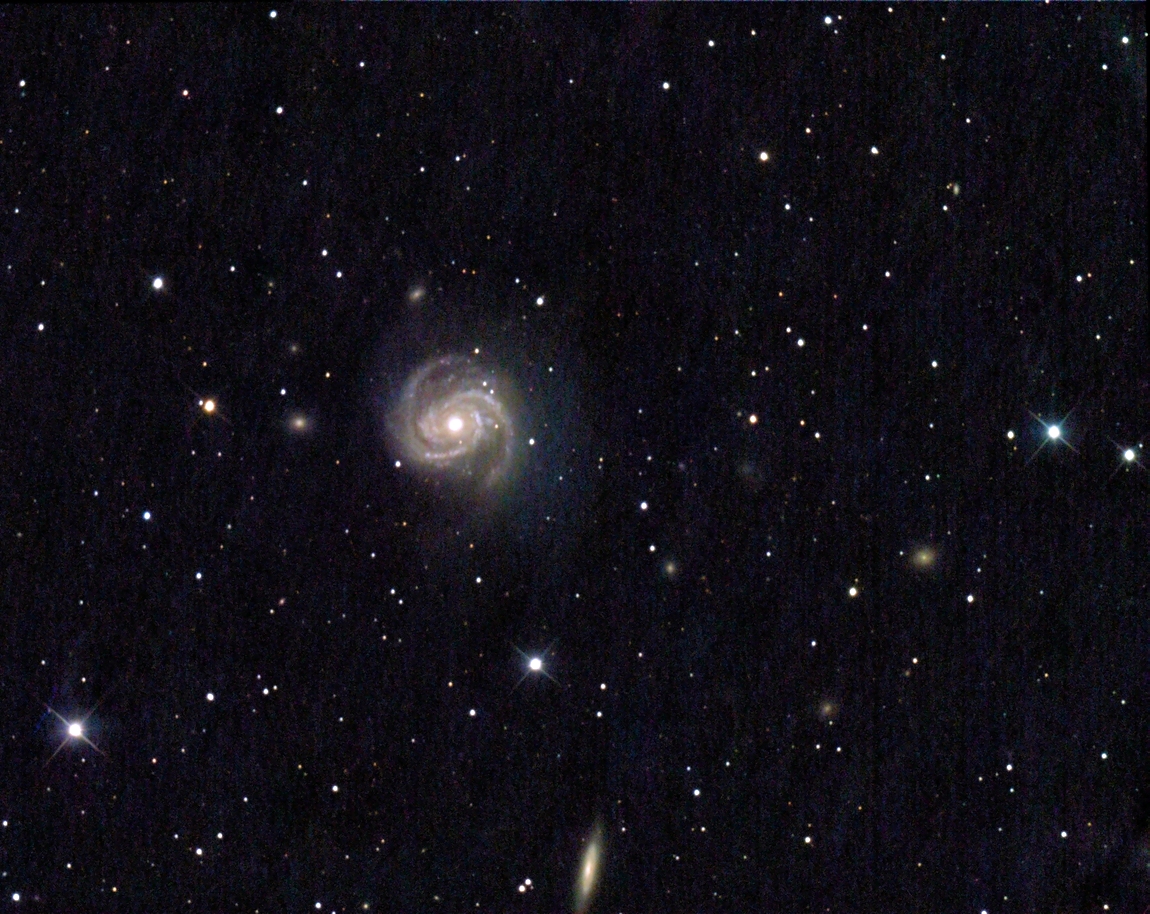 Balkenspiralgalaxie M100 (Com) mit umgebenden lichtschwachen Galaxien am 22.03.2026, f = 1200 mm, QHY294C, IRB-Filter, skaliert auf 35% und 50% der Originalauflösung (große Bilder skaliert auf 50% und 70% der Originalauflösung).