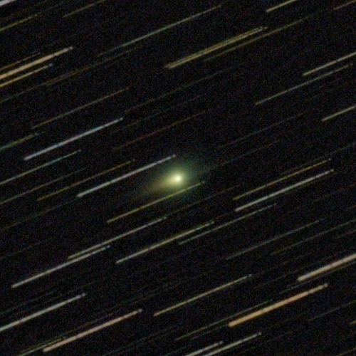 Interstellarer Komet 3I/ATLAS am 15.12.2025, f = 600 mm, QHY294C, IRB-Filter, 04:00 UT, 02:17 Stunden Belichtungszeit, 50%, 70% und 100% der Originalauflösung. Die Coma des Kometen erscheint elongiert, und sein kurzer Schweif ist ebenfalls sichtbar. Der äußere Bereich der Coma zeigt andeutungsweise eine grünliche C2-Emission, insgesamt wird die Coma jedoch durch das gelbliche, von der Staubkomponente gestreute Sonnenlicht dominiert.