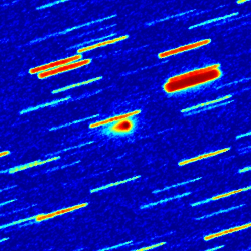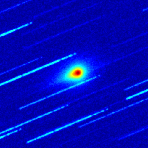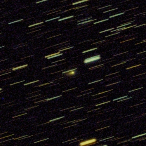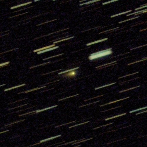 Interstellarer Komet 3I/ATLAS am 25.12.2025, f = 300 mm, QHY294C, IRB-Filter, 04:30 UT, 02:54 Stunden Belichtungszeit, 70% und 100% der Originalauflösung. Der Komet zeigt weiterhin einen kurzen Schweif, und die gelbliche Farbe deutet darauf hin, dass sowohl die Coma als auch der Schweif von Staub dominiert werden. Interessanterweise scheint es so, als ob der Schweif zur Sonne zeigen würde, also nach Südosten (unten links). Dies ist wahrscheinlich ein Projektionseffekt, da sich die Erde zur Zeit zwischen der Sonne und dem Kometen befindet, so dass ein irdischer Beobachter den Schweif "von vorne" sieht, da er in Wirklichkeit von der Sonne und der Erde weg zeigt. Unter dieser Beobachtungsgeometrie würde bereits eine leichte Krümmung des Schweifs den optischen Eindruck erwecken, als zeige er zur Sonne und die Coma sei in die gleiche Richtung elongiert.