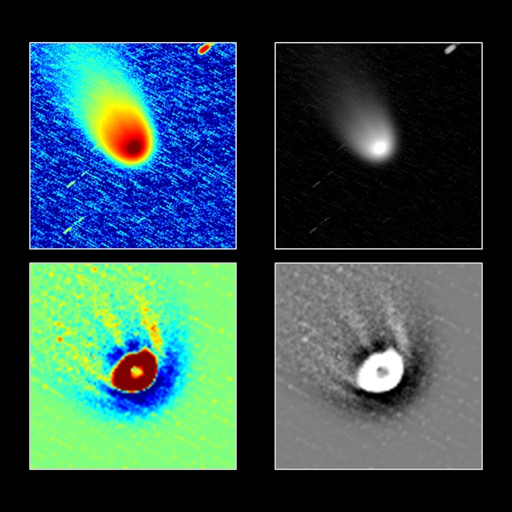 Komet C/2025 A6 (Lemmon) am 27.10.2025, f = 600 mm, DZK 33UX250, 570-nm-Orange-Kantenfilter, ca. 18:00 UT, 5:04 Minuten Belichtungszeit. Die obere Reihe zeigt das logarithmisch skalierte Intensitätsbild in Falschfarben und in Graustufen. Der Staubschweif weist drei schwache lineare Strukturen auf, die aus der inneren Coma hervortreten. Diese Staub-Jets werden in den darunter wiedergegebenen, hochpassgefilterten und vergrößerten Bildversionen hervorgehoben.