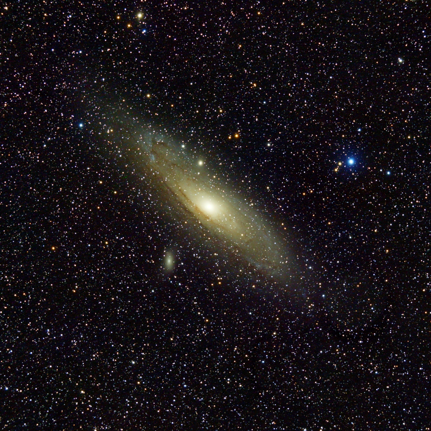 Andromeda-Galaxie M31 (And) und ihre Begleiter M32 und M110 am 18.10.2023, f = 135 mm, QHY294C, IRB-Filter, RGB-Bild, skaliert auf 50%, 70% und 100% der Originalauflösung (große Bilder skaliert auf 70% und 100% der Originalauflösung). Für die mittleren Bilder wurde zur Korrektur der Intensitätsverläufe im Hintergrund und zur Kontrastanpassung die Software GraXpert verwendet. Im untersten Bild wurde die Intensität des Grünkanals durch eine Gamma-Transformation abgesenkt.