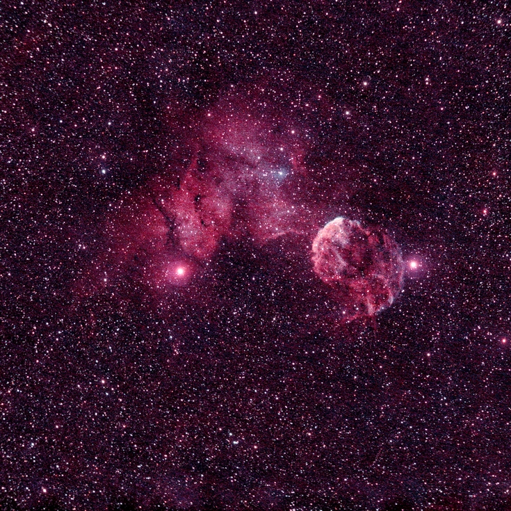 HII-Region IC5146 ("Cocoon Nebula") (Cyg) am 02.09.2024, f = 600 mm, QHY294C, mit IRB-Filter, skaliert auf 35% und 70% der Originalauflösung (große Bilder skaliert auf 50%, 70% und 100% der Originalauflösung). Die rote, Hα-Strahlung emittierende Komponente des Nebels ist von einem "Kokon" aus diffusem Material umgeben, das bläulich erscheint, da es das Licht der umliegenden jungen und heißen Sterne streut. Einer dieser relativ hellen Sterne unmittelbar westlich (rechts) des Nebels ist sogar von einem eigenen kleinen blauen Reflexionsnebel umgeben. Der Nebel ist auch mit einer länglichen Dunkelwolke assoziiert, die an einigen Stellen, an denen sie das Licht der dahinter liegenden Sterne streut, in einem rötlich-braunen Farbton erscheint.